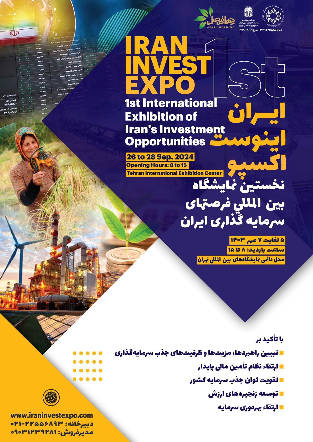 1st International exhibition of Iran's Investment Opportunities and Developing Business Relations with Iran will be held on September 26-28, 2024 at the Tehran International Permanent Fairground to promote global trade, attract strategic investments, and foster sustainable economic relations with Iran.