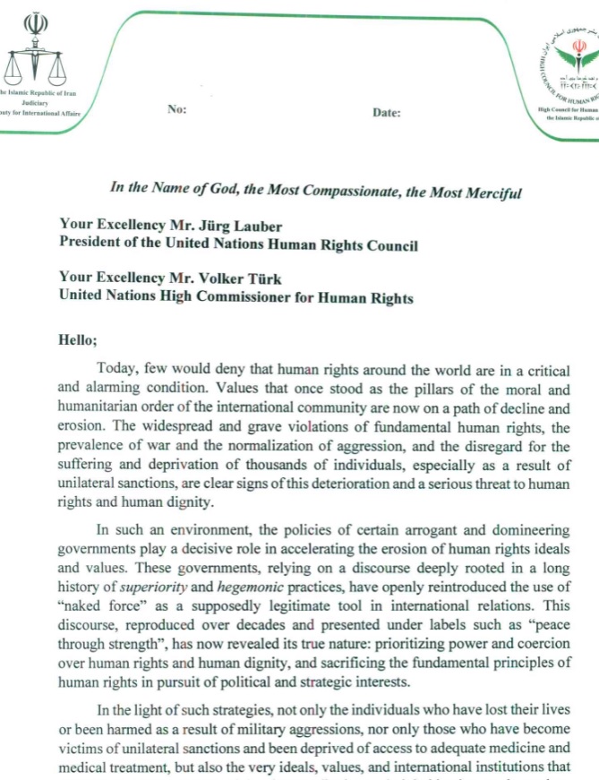 The letter of the Secretary of the Human Rights Headquarters to the President of the Human Rights Council and the High Commissioner for Human Rights regarding the negative effects of unilateral sanctions in the field of health