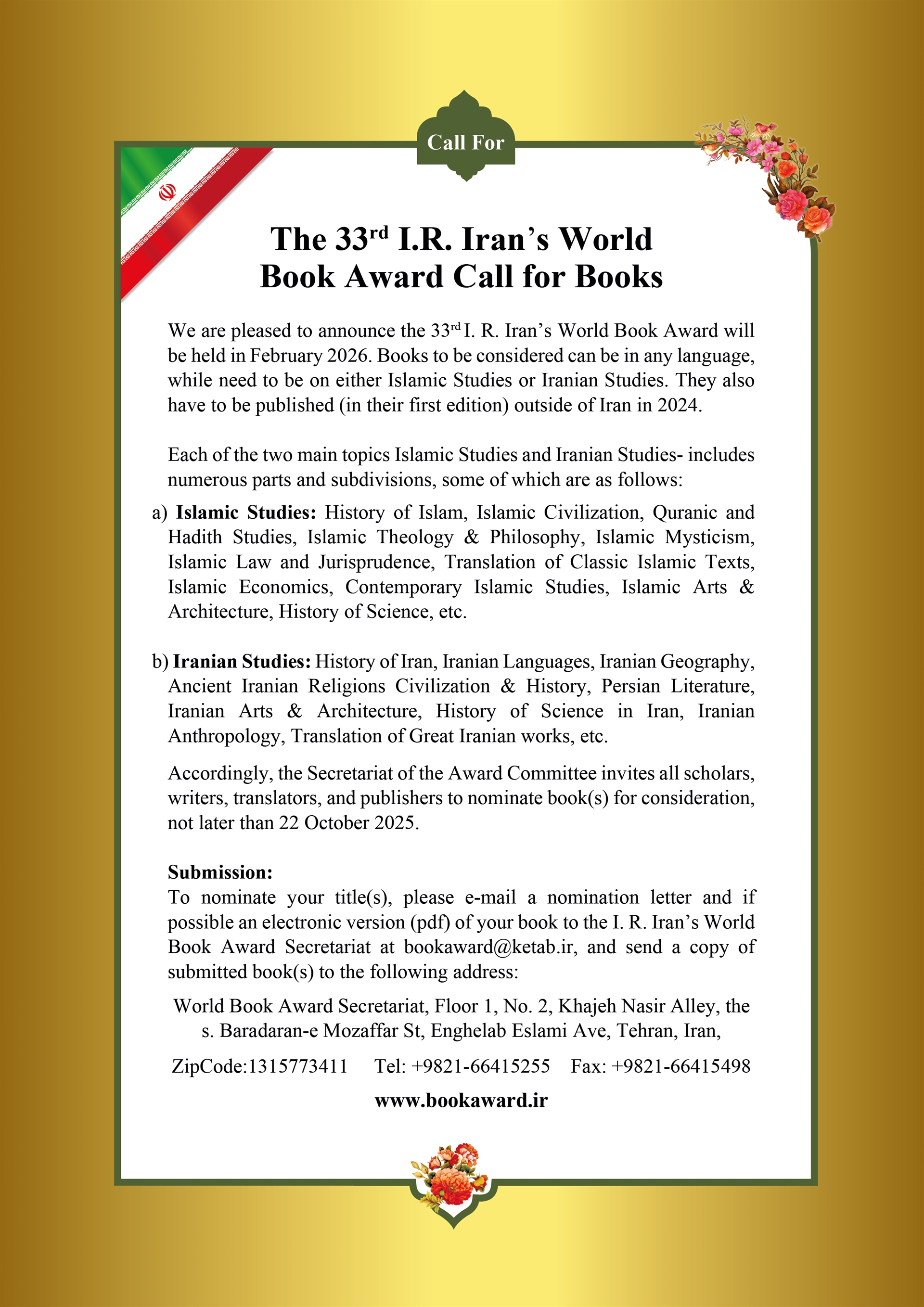 33rd Iran World Book Award Call For Books