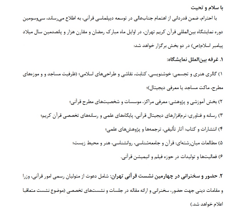 سی و سومین نمایشگاه بین المللی قرآن کریم در تهران در اوایل ماه مبارک رمضان و مقارن با هزار و پانصدمین سال میلاد پیامبر اسلام (ص) در دو بخش برگزار می‌شود.