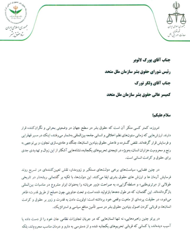 نامه دبیر ستاد حقوق بشر به رئیس شورای حقوق بشر و کمیسر عالی حقوق بشر در خصوص آثار منفی تحریم های یکجانبه در حوزه بهداشت و سلامت