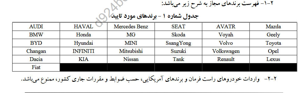 2.2- واردات خودروهای راست فرمان و ویژندهای آمریکایی ، حسب ضوابط و مقررات جاری کشور ، ممنوع می‌باشد ؛